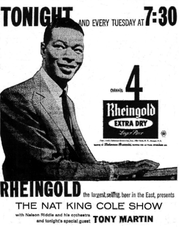 On November 5, 1956, The Nat King Cole Show debuted on NBC. The variety program was the first of its kind hosted by an African-American, which created controversy at the time. Beginning as a 15-minute pops show on Monday night, the program was expanded to a half hour in July 1957. Despite the efforts of NBC, as well as many of Cole’s industry colleagues—many of whom, such as Ella Fitzgerald, Harry Belafonte, Frankie Laine, Mel Tormé, Peggy Lee, and Eartha Kitt, worked for industry scale (or even for no pay) in order to help the show save money—The Nat King Cole Show was ultimately done in by lack of a national sponsorship. Companies such as Rheingold Beer assumed regional sponsorship of the show, but a national sponsor never appeared.
