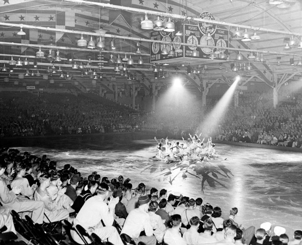Throughout the following 30 years the Pan-Pacific would host the Ice Capades and the Harlem Globetrotters, serve as home to the Los Angeles Monarchs of the Pacific Coast Hockey League along with UCLA ice hockey, UCLA men’s basketball, USC men’s basketball, professional tennis, car shows, political rallies and circuses. During the 1940s it was used for audience-attended national radio broadcasts and in the 1950s for televised professional wrestling shows. At its height, most major indoor events in Los Angeles were held at the Pan-Pacific. Leopold Stokowski conducted there in 1936, 1950s actress Jeanne Crain was crowned “Miss Pan Pacific” there in the early 1940s, General Dwight D. Eisenhower spoke to a beyond-capacity crowd of 10,000 in 1952 a month before being elected President of the United States, Elvis Presley performed there in 1957 shortly before he was drafted into the Army and Vice President Richard Nixon addressed a national audience from the Pan-Pacific in November 1960. The building carried on as Los Angeles’ primary indoor venue until the 1972 opening of the much larger Los Angeles Convention Center, after which the Pan-Pacific Auditorium was closed.