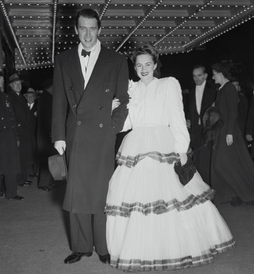 In July 1938, de Havilland began dating business tycoon, aviator, and filmmaker Howard Hughes, who had just completed his record-setting flight around the world in 91 hours. In addition to escorting her about town, he gave the actress her first flying lessons. She later said, “He was a rather shy man … and yet, in a whole community where the men every day played heroes on the screen and didn’t do anything heroic in life, here was this man who was a real hero.” In December 1939, de Havilland began a romantic relationship with actor James Stewart. At the request of Irene Mayer Selznick, the actor’s agent asked Stewart to escort de Havilland to the New York premiere of Gone with the Wind at the Astor Theater on December 19, 1939. Over the next few days, Stewart took her to the theater several times and to the 21 Club. They continued to see each other back in Los Angeles, where Stewart provided occasional flying lessons and romance. According to de Havilland, Stewart proposed marriage to her in 1940, but she felt that he was not ready to settle down. Their relationship ended in late 1941 when de Havilland began a romantic relationship with film director John Huston while making In This Our Life. “John was a very great love of mine,” she would later admit, “He was a man I wanted to marry.”
